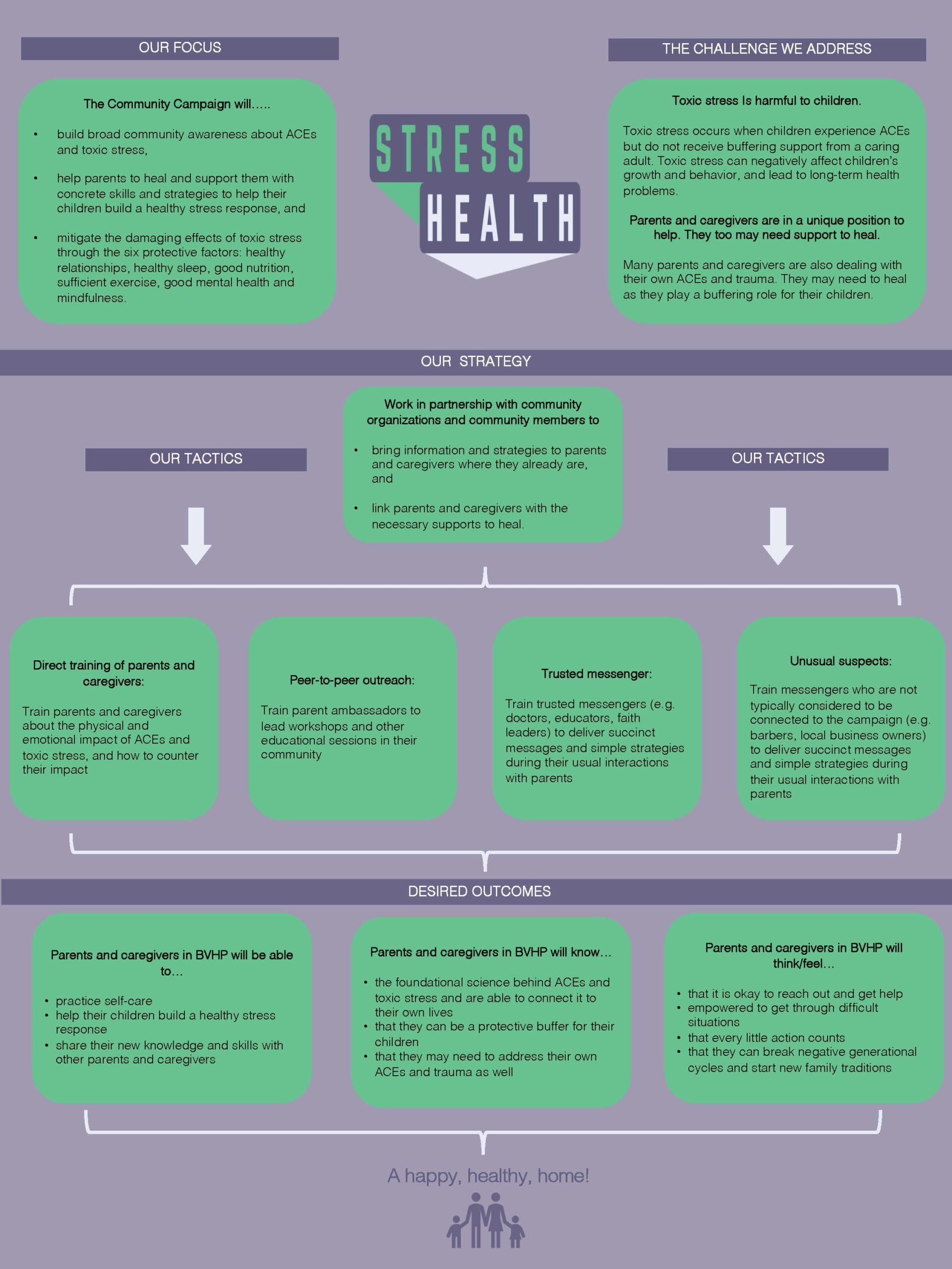 - A Theory of Action for Stress Health that outlined the unique assets of the Stress Health campaign, the key components of the proposed community model, and anticipated benefits for participating parents and children.